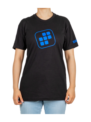 Black shirt with blue Stata icon on the front and blue logo on the sleeve.